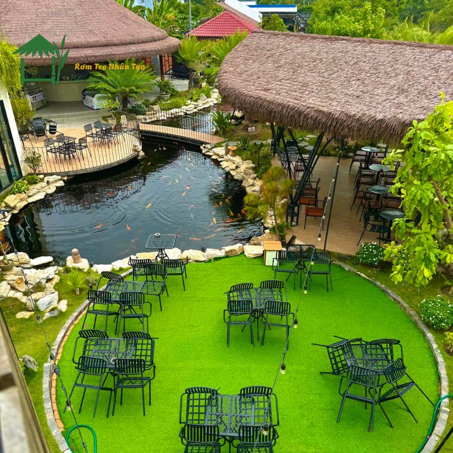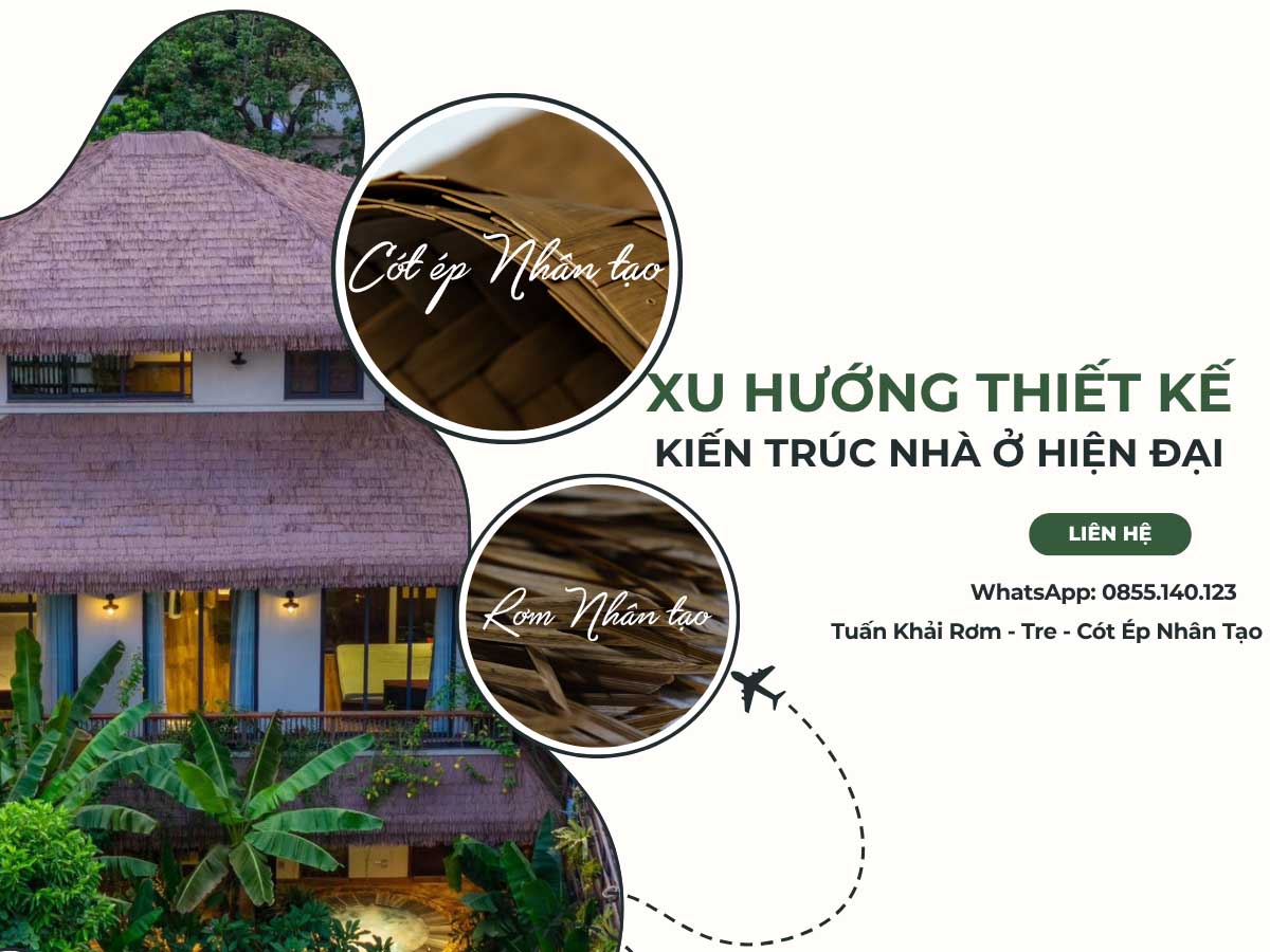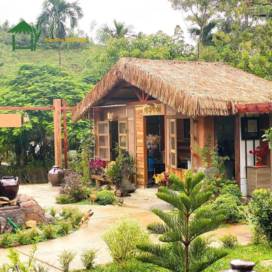Sự kết hợp kiến trúc nhà gỗ với các vật liệu nhân tạo cao cấp như mái rơm nhân tạo và cót...