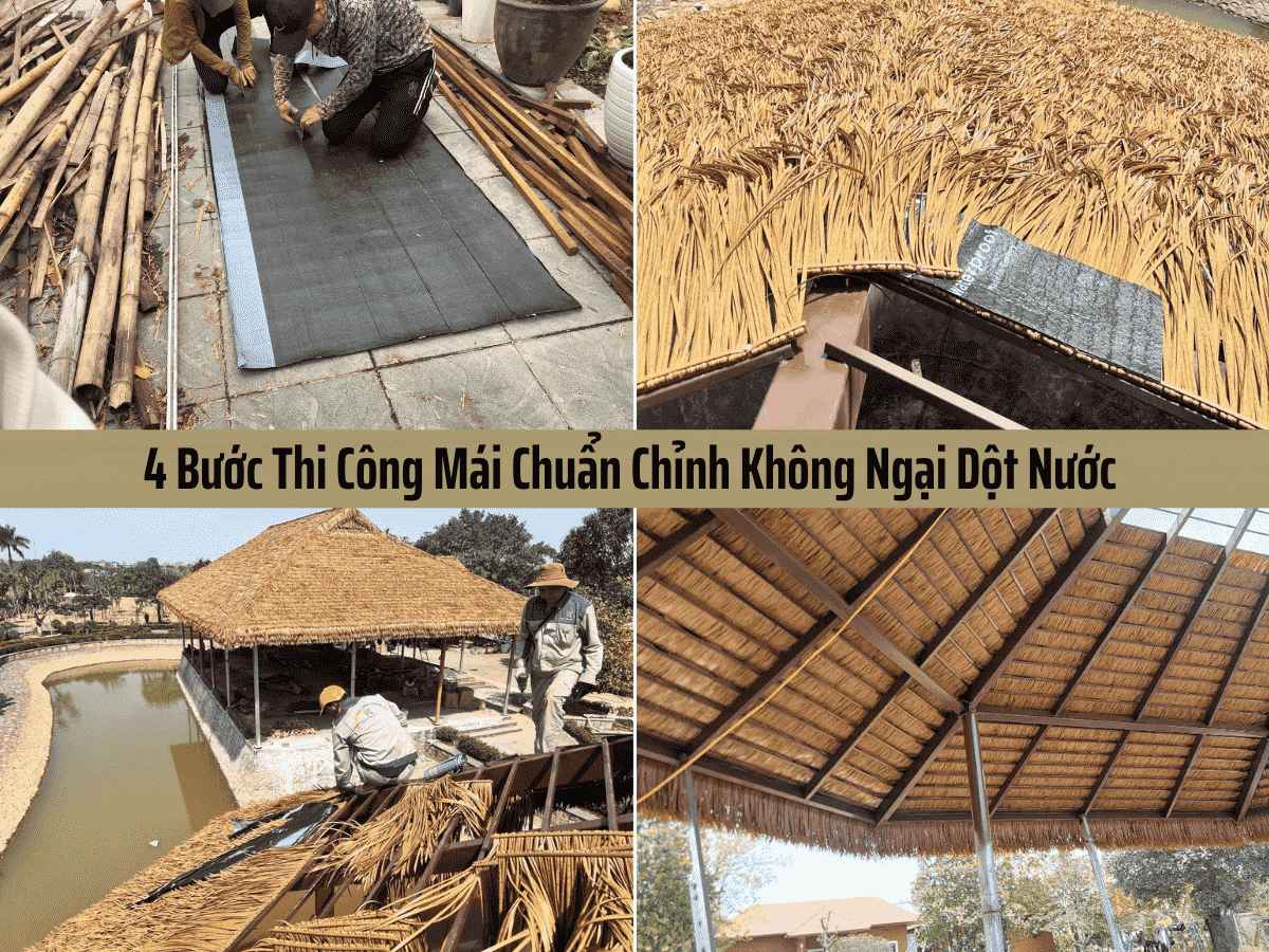 Cỏ rơm vàng dạng thảm cuộn sẵn, chỉ cần trải và bắn vít cố định là hoàn thiện, chi phí lợp...