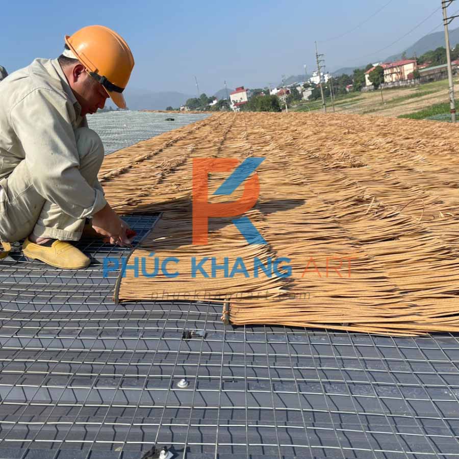 Sau khi cố định lưới vào mái bằng vít nở hoặc vít sắt, các lớp rơm sẽ được cột trực tiếp lên lưới bằng dây kẽm hoặc dây nhựa rút chuyên dụng. Phương pháp này vừa chắc chắn, vừa tiết kiệm thời gian.