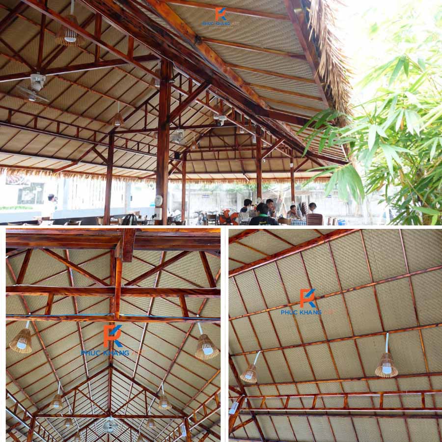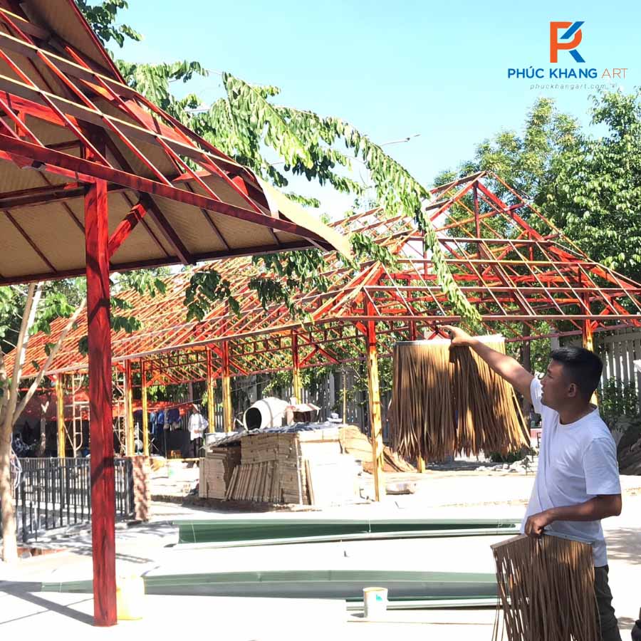 Bước cuối cùng là lợp rơm nhân tạo lên trên lớp lưới hàn. Tại công trình nhà hàng Hồ Sen, rơm nhân tạo màu vàng xám được sử dụng để tạo cảm giác mộc mạc, gần gũi nhưng không kém phần sang trọng.