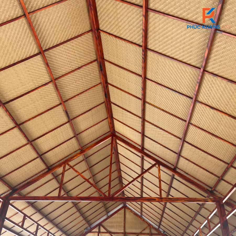 Sau khi hoàn thiện khung mái, bước tiếp theo là trải cót ép nhân tạo. Tại dự án Vạn Phúc, loại cót được sử dụng là màu vàng, khổ 1.5m x 7m, kiểu đan xương cá – một kiểu đan mang tính thẩm mỹ cao, tạo cảm giác tinh tế và đồng đều cho toàn bộ mái công trình.