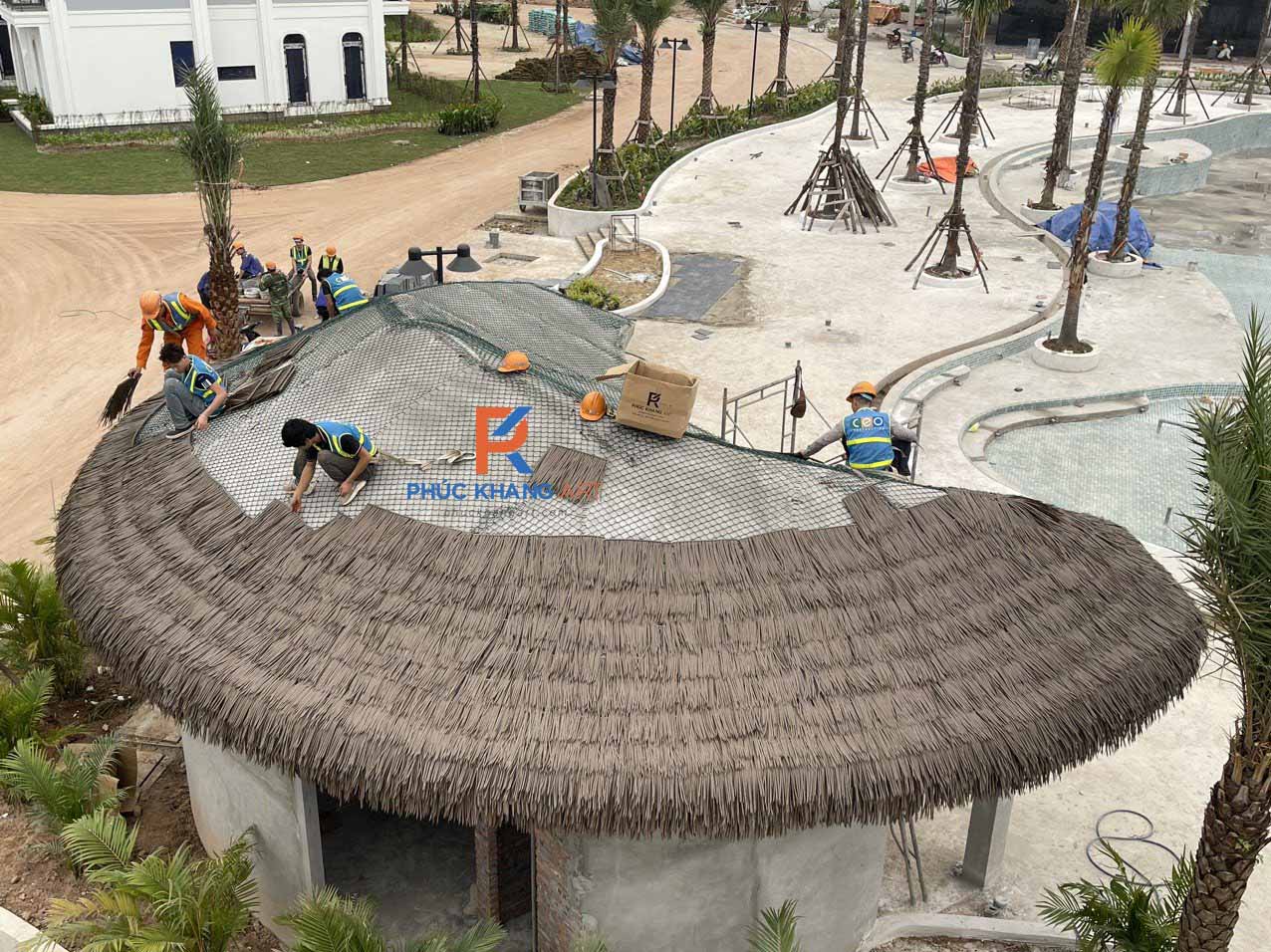 - Thi công rơm nhân tạo lợp mái chống cháy, chống sức gió,có độ bám dính chắc chắn, chống ăn mòn, chống sâu bệnh, chim và nấm.