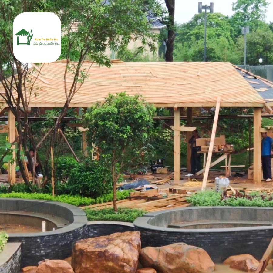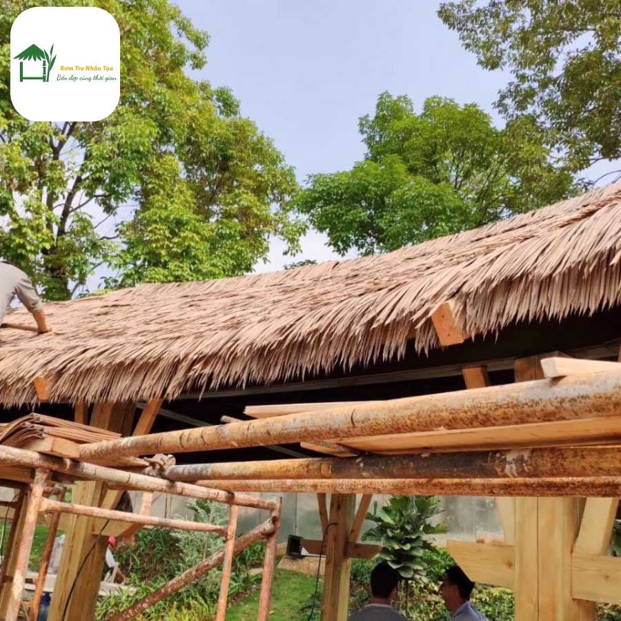 Hình ảnh mái rơm mộc mạc, thân quen của làng quê Việt Nam được tái hiện chân thực, nhưng với vật liệu rơm nhân tạo – một giải pháp bền hơn, thẩm mỹ hơn và thân thiện với môi trường.