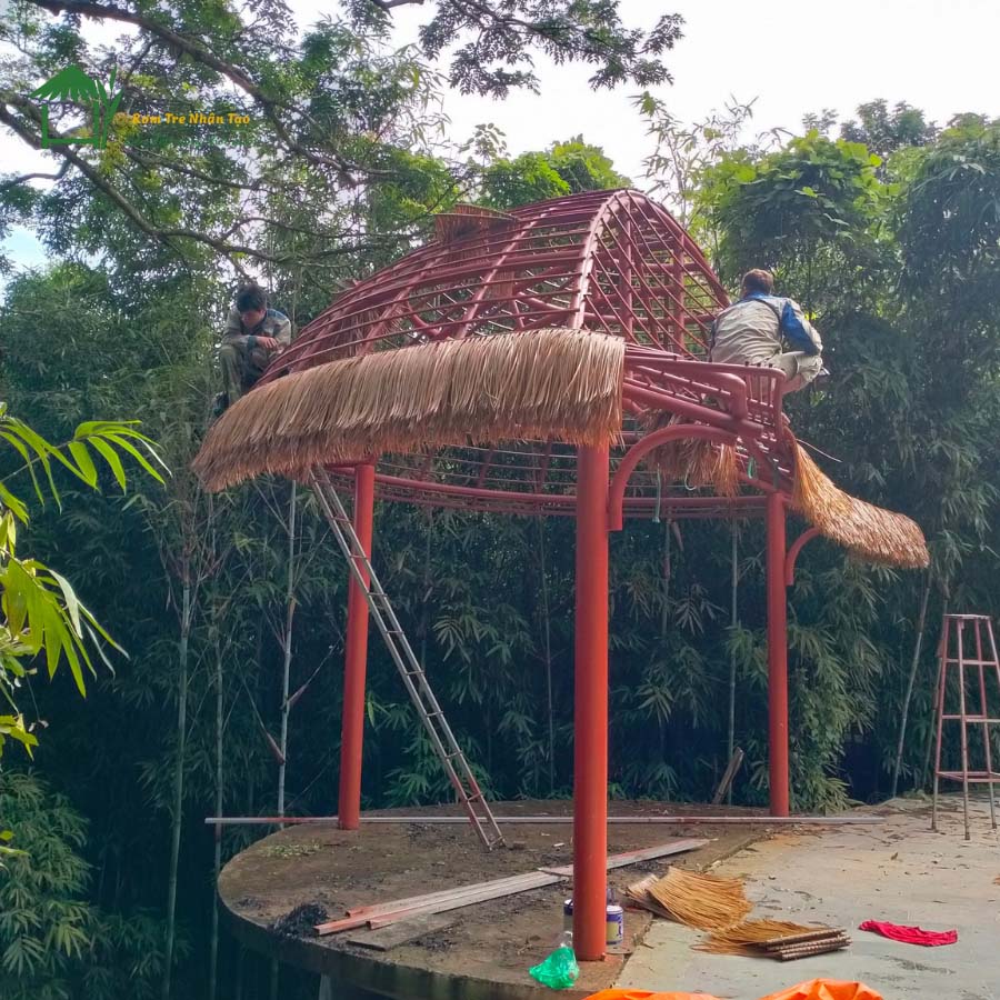 - Chòi ngũ giác lợp rơm – khung thép giả tre – thiết kế mở 360°.