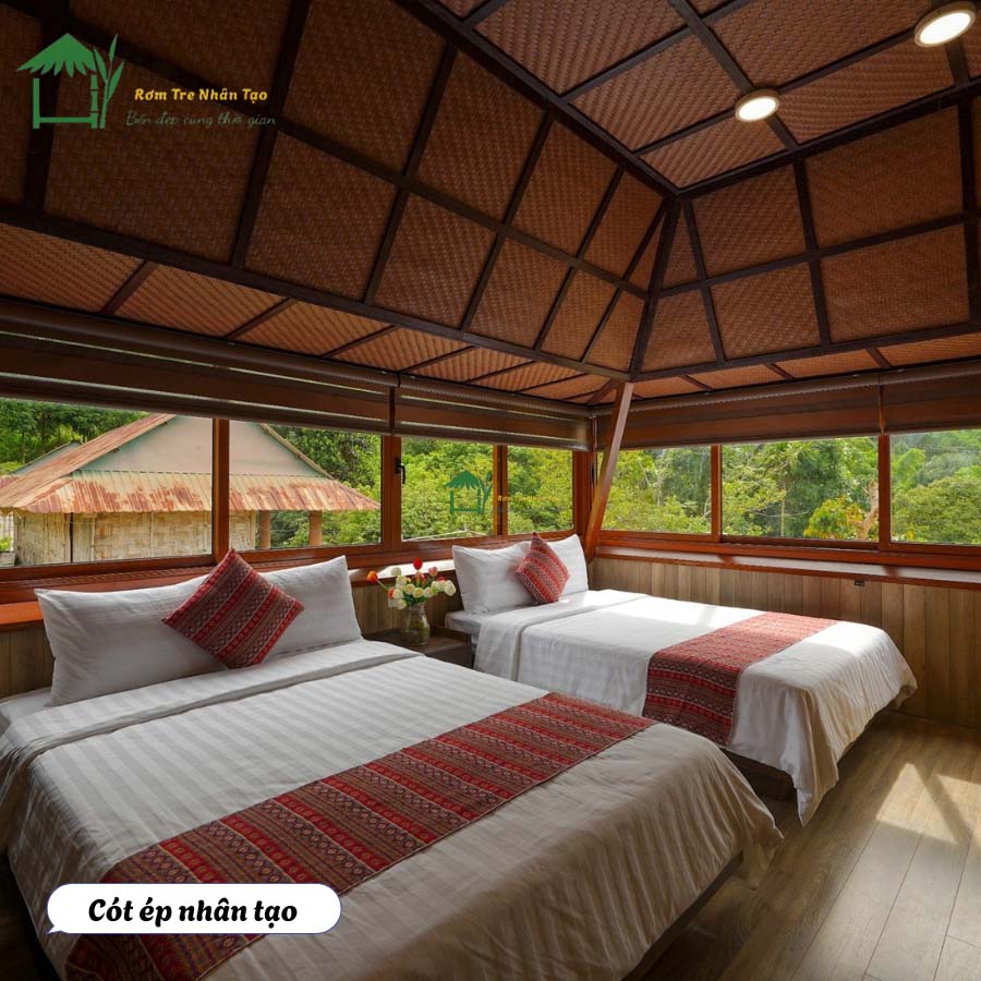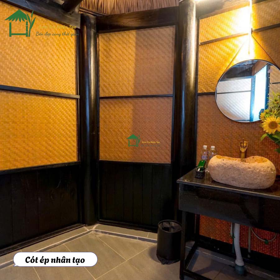 • Phối hợp vật liệu khác: dễ kết hợp với tre nhân tạo, rơm nhân tạo, lam giả gỗ, đèn mây tre.