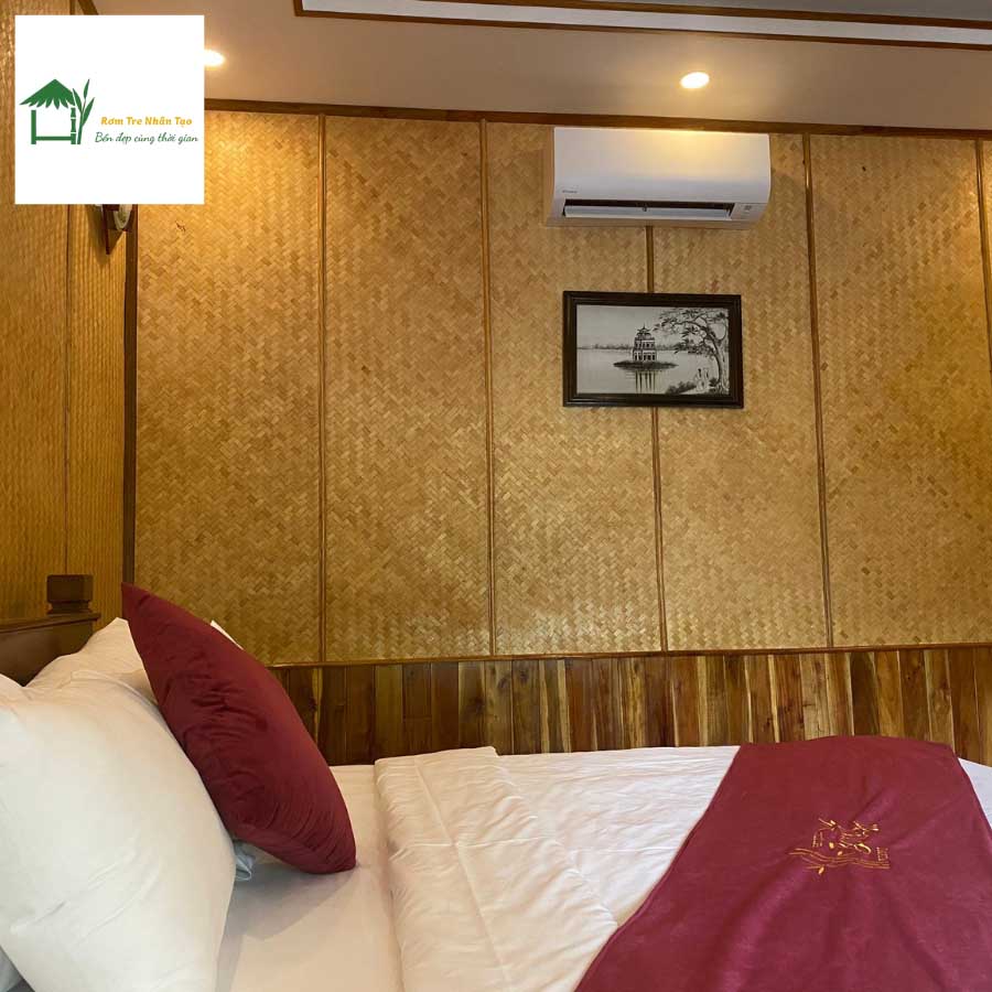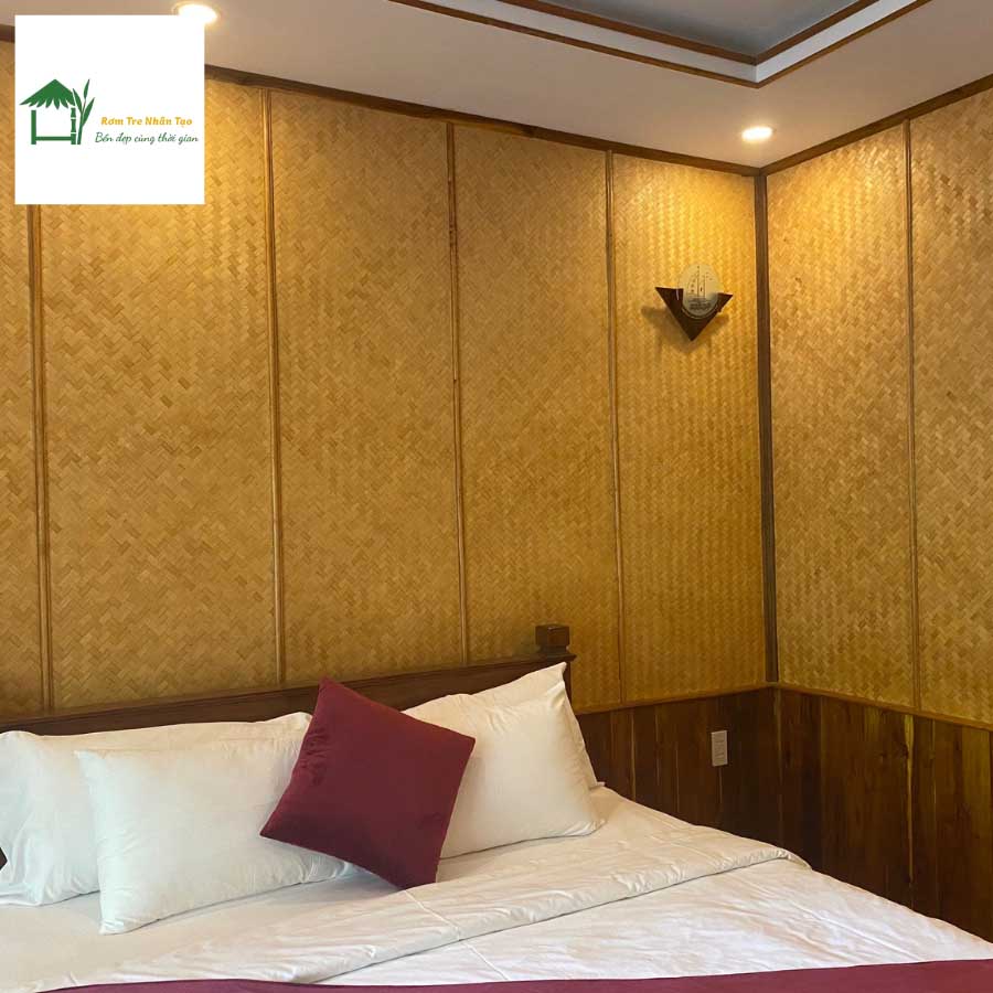 Thay vì ốp gạch, gỗ hay sơn màu, nhiều homestay hiện đại lựa chọn ốp vách bằng cót ép nhân tạo để làm điểm nhấn cho khu vực đầu giường, hành lang, khu tiếp khách, hay phòng ăn. Cảm giác mộc mạc và ấm cúng từ bề mặt đan lát giúp không gian trở nên “Instagrammable”.