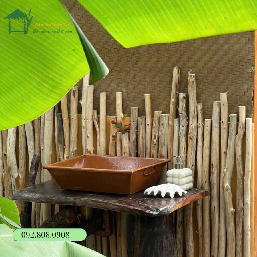 Góc nhỏ sân vườn sử dụng cót ép nhân tạo làm vách ngăn nhà tắm