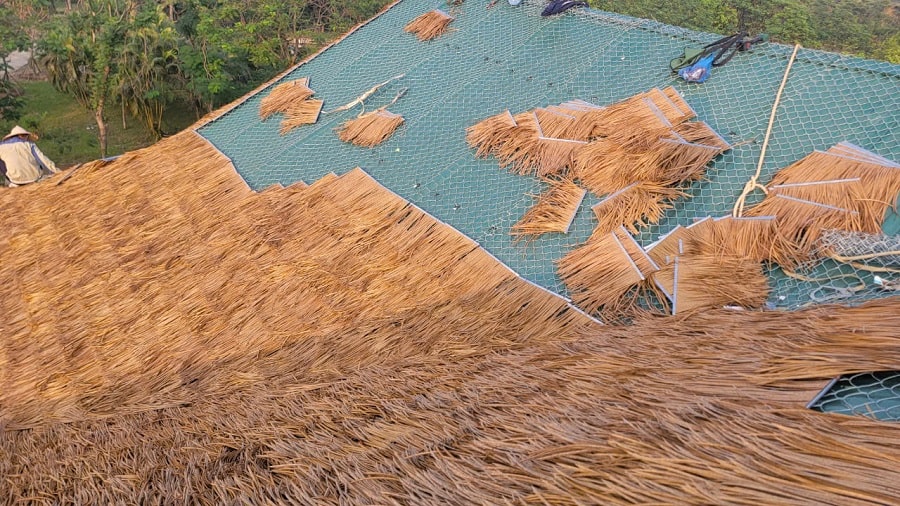 Cuối cùng, các tấm rơm được cố định bằng dây đồng, đảm bảo độ dày phù hợp để lợp mái chống dột và tạo độ rũ tự nhiên.