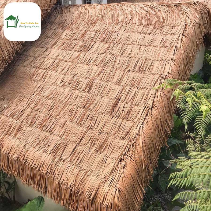 Rơm nhân tạo màu vàng xám 50x50cm là dòng vật liệu trang trí mái đang được nhiều chủ đầu tư resort, nhà hàng và homestay ưa chuộng trong năm 2025.