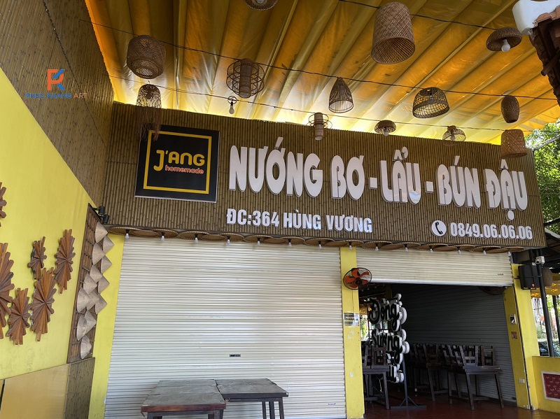 Tấm ốp tre nhân tạo là lựa chọn phổ biến trong thiết kế bảng hiệu nhà hàng, quán ăn, quán cà phê sân vườn mang phong cách truyền thống.