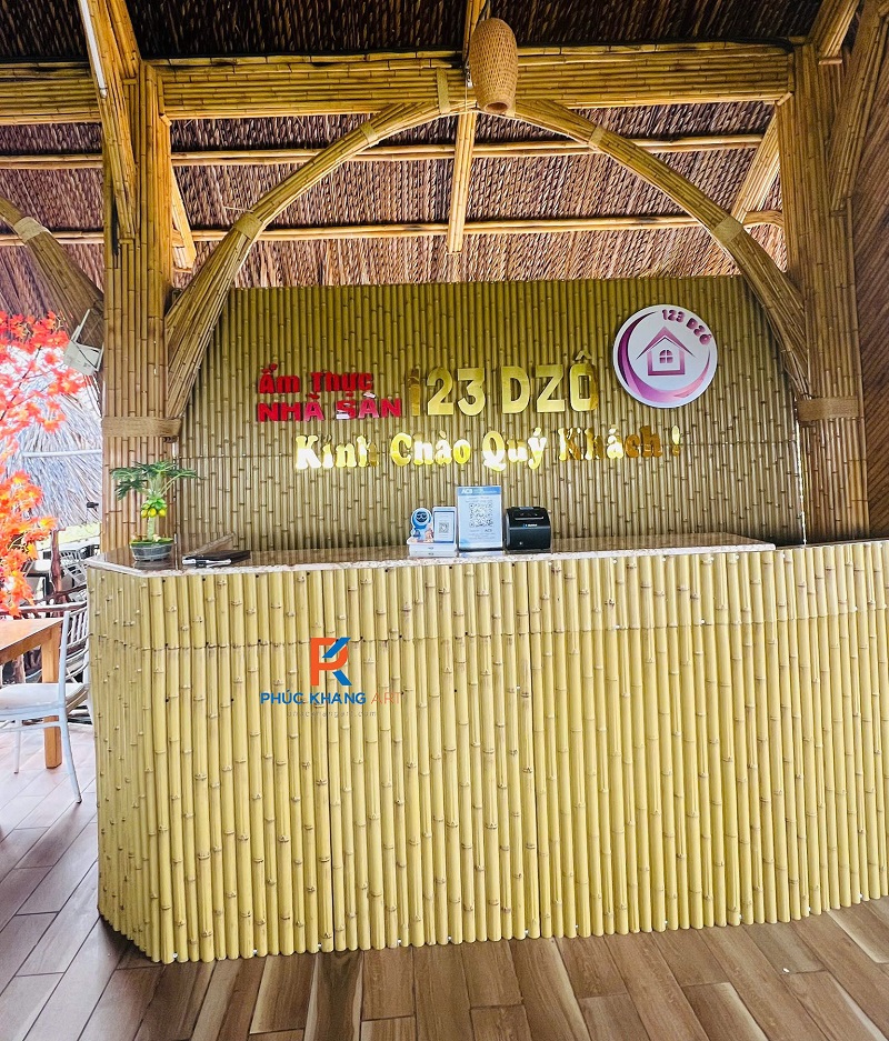 Ốp tre cho quầy bar hay quầy lễ tân giúp tăng điểm nhấn thị giác, tạo ấn tượng đầu tiên với khách hàng. Tấm tre nhân tạo có thể uốn cong nhẹ hoặc ốp phẳng tùy thiết kế, dễ dàng tạo hình và thi công.