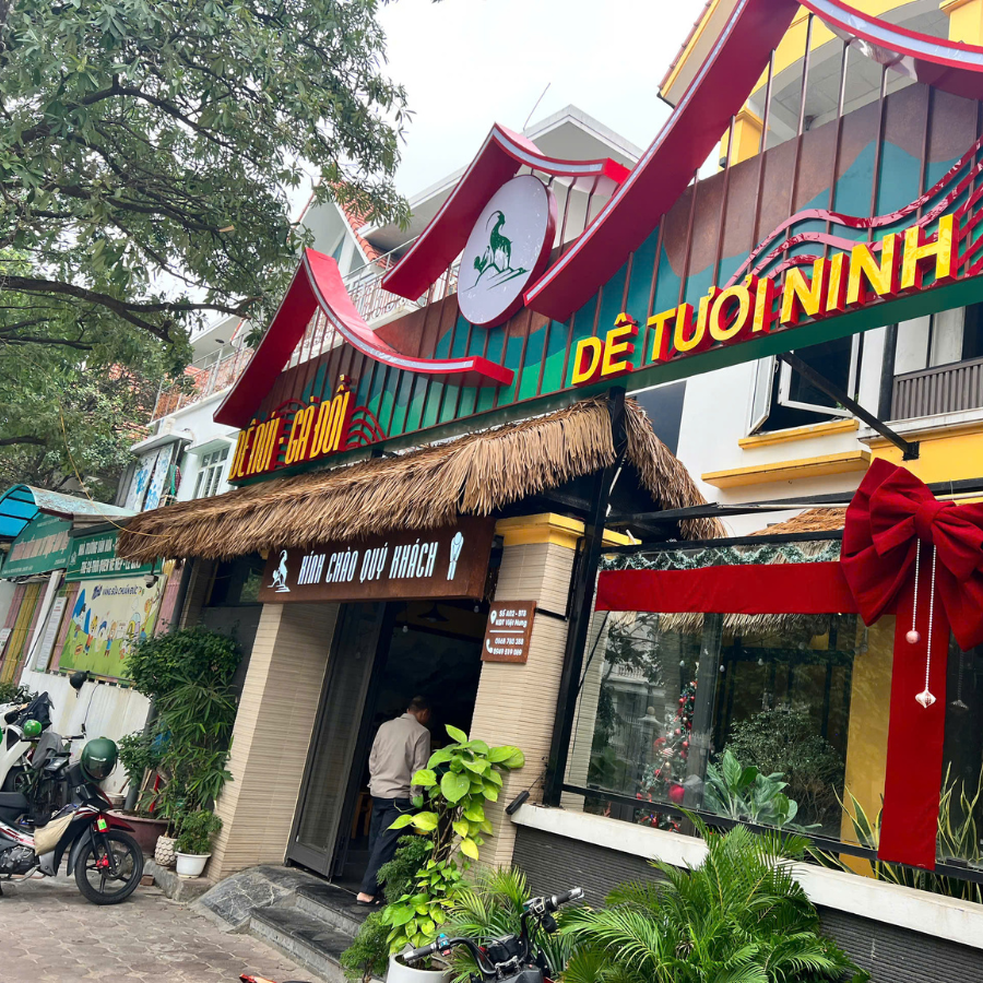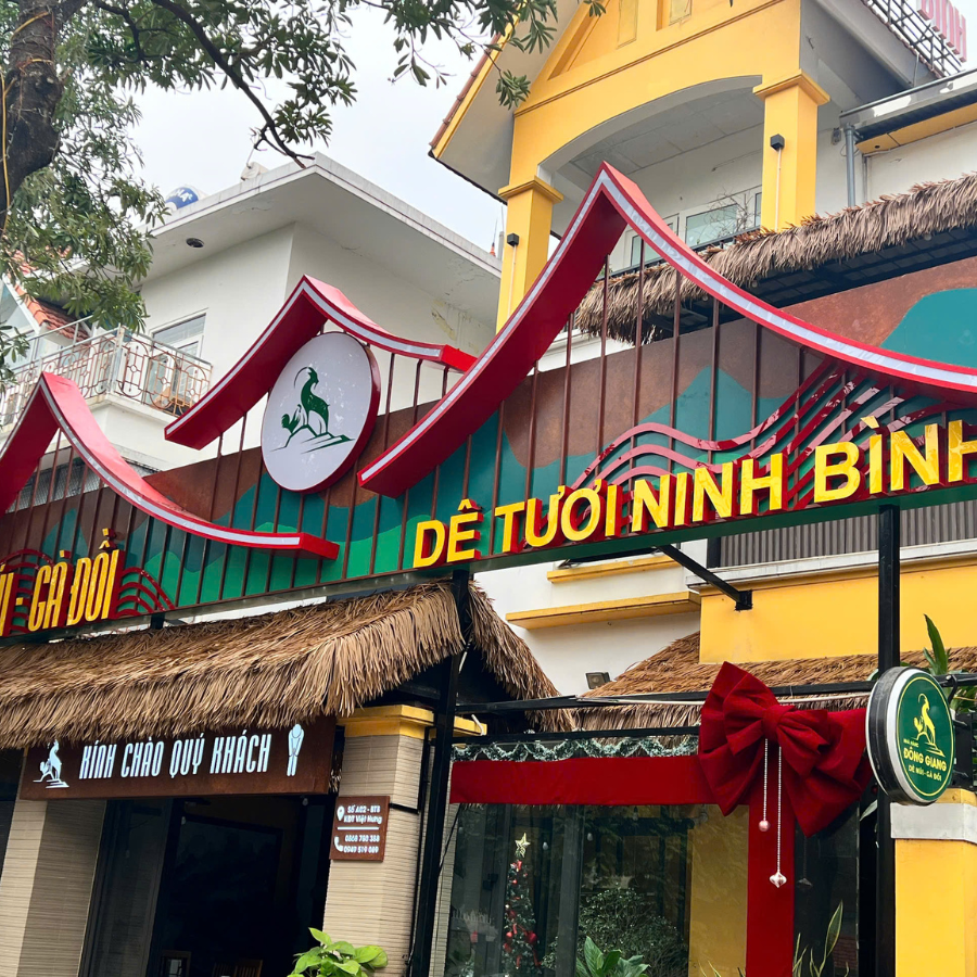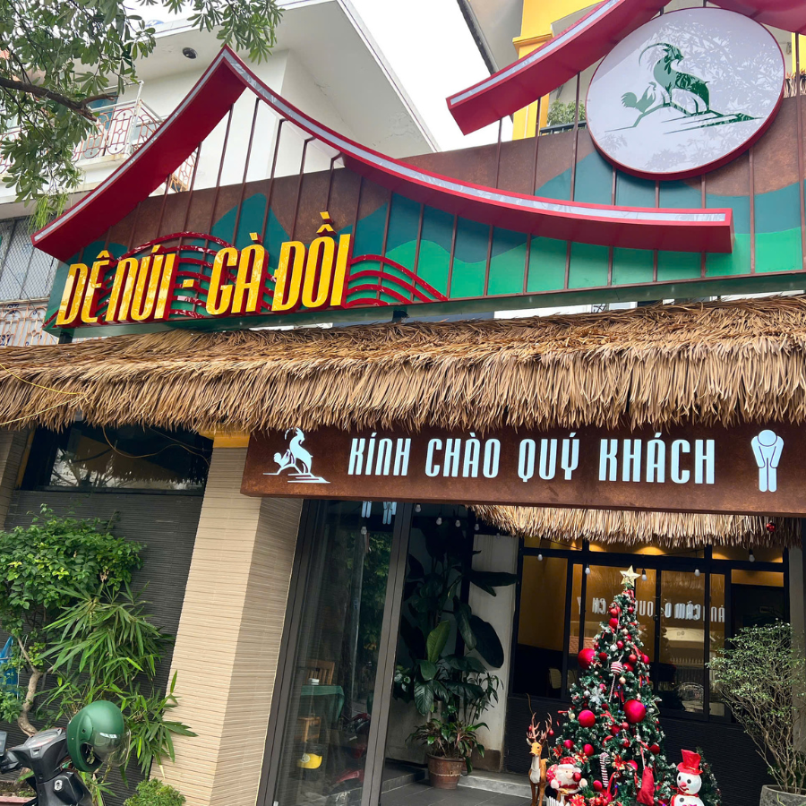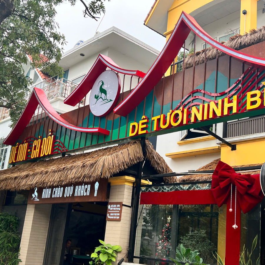 Dê Tươi Ninh Bình là chuỗi nhà hàng chuyên các món dê đặc sản, nổi tiếng với không gian đậm chất đồng quê Bắc Bộ. Kiến trúc của nhà hàng thường gắn liền với các vật liệu truyền thống như gỗ, tre, rơm, tranh… Tuy nhiên, với điều kiện khí hậu và yêu cầu vận hành hiện đại, Dê Tươi Ninh Bình đã lựa chọn rơm nhân tạo để decor quán thay vì rơm thật để đảm bảo độ bền, tính thẩm mỹ lâu dài, và giảm thiểu công bảo trì.